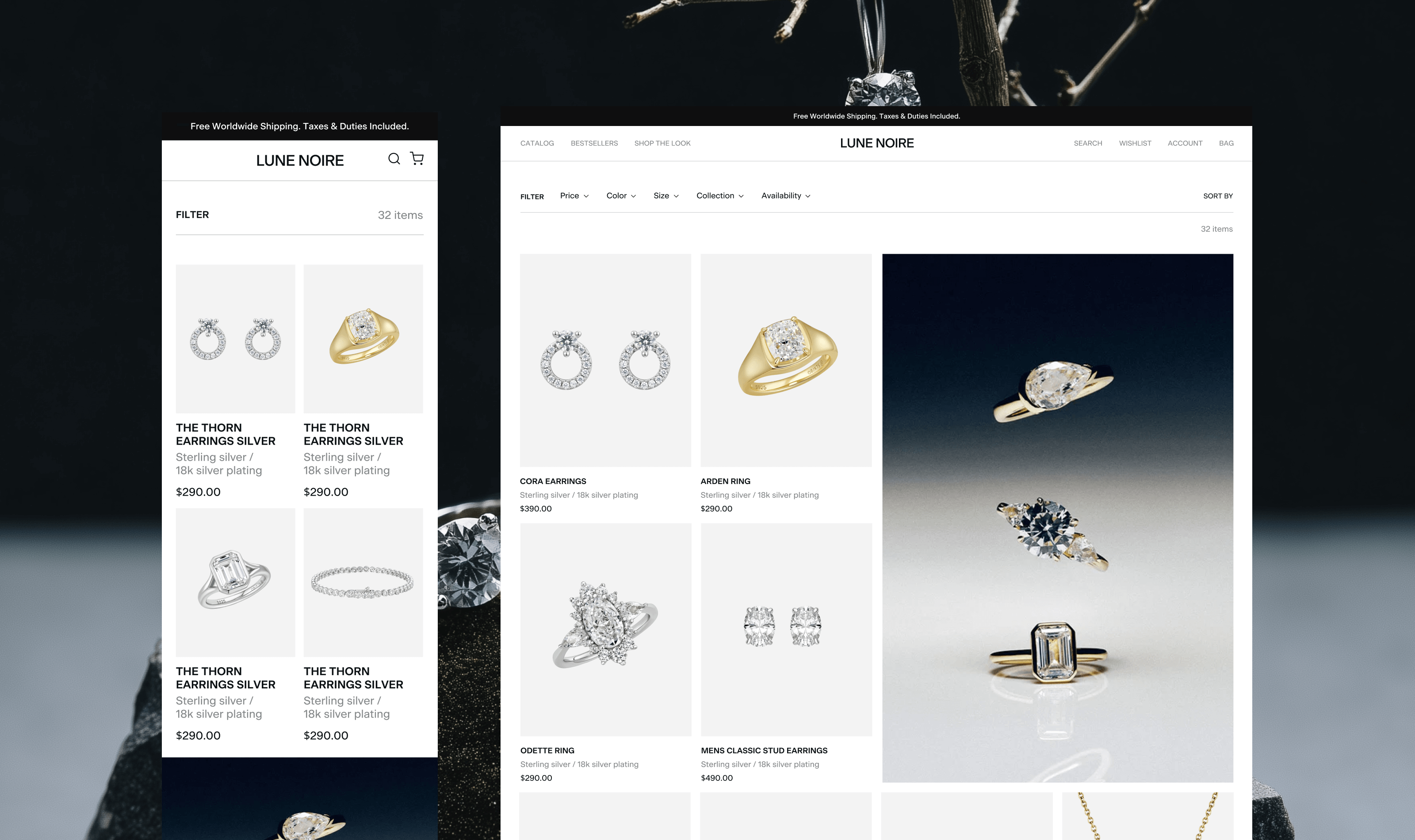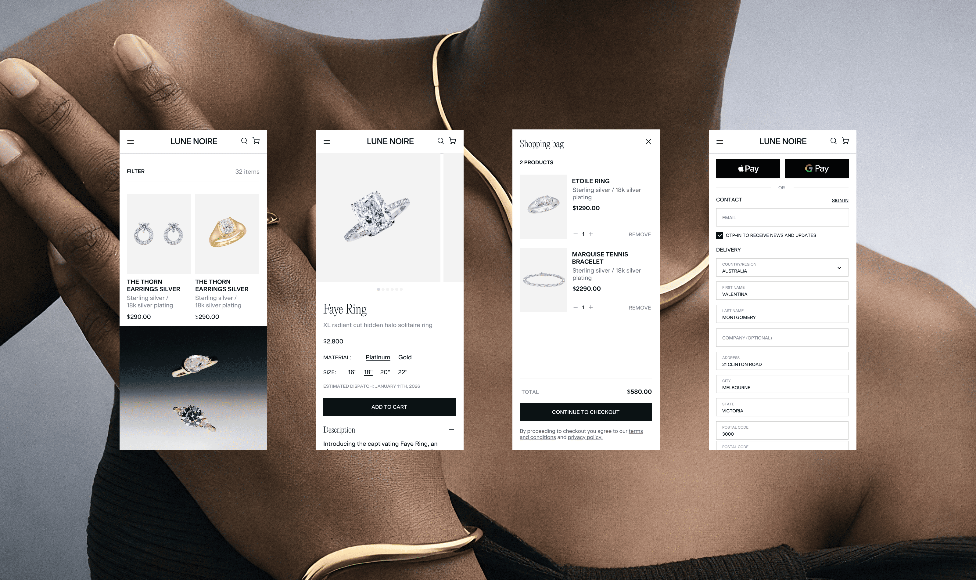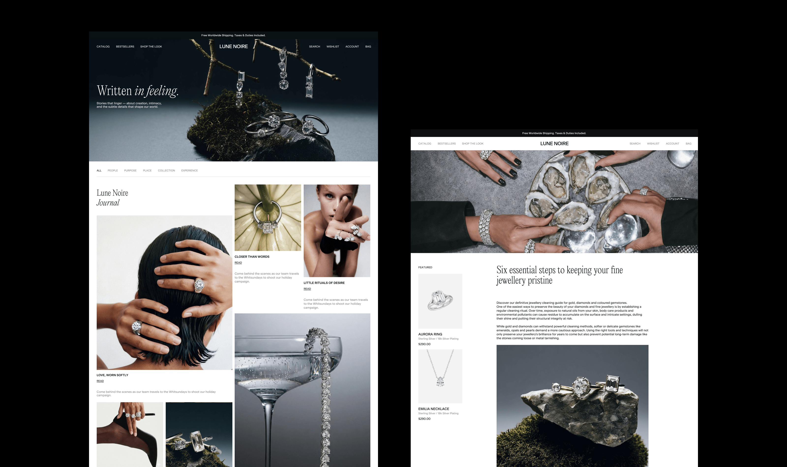 Lune Noire is a dark-romantic jewelry brand rooted in intimacy, contrast, and quiet luxury. The visual language is built around tension — softness and edge, restraint and desire. Romantic grunge textures meet clean layouts, creating a balance between emotion and clarity.